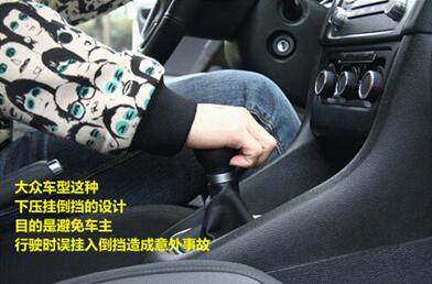 我们最初应该是在驾校用教练车来学挂倒挡了(部分人除外),而教练车绝大多数都是老捷达。这款车挂倒挡的方式是,先把挡把垂直往下按,然后再拔入一挡的位置。这个好像是所有大众车型通用的入倒挡方式,这样的设计利用一个下压的操作,给挂倒挡提供一个保险,避免车主误挂倒挡。