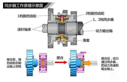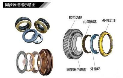 这里顺便说下什么是同步器?对我们挂档有什么用?变速器在进行换档操作时,尤其是从高档向低档的换档很容易产生轮齿或花键齿间的冲击。为了避免齿间冲击,在换档装置中都设置同步器。同步器有常压式和惯性式两种,目前大部分同步式变速器上采用的是惯性同步器,它主要由接合套、同步锁环等组成,主要是依靠摩擦作用实现同步。