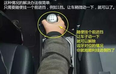 如果离合踩尽了,依然是挂不进,那就有可能是齿轮的齿位刚好对上了。因为很多车型的倒挡没有装同步器,所有总会有机率在你挂倒挡时,刚好两个齿轮的齿位对位,卡不进去倒挡就挂不进了。解决这个问题的办法很简单,1挡2挡3挡……随便挂一个挡位,让齿轮转动一下,然后再挂倒挡就可以了。
