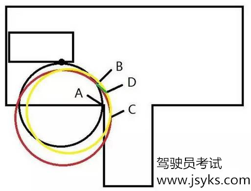 网上流行的三把方向,到B点时回正方向,这时车按绿线行驶,到D点时再打死,这时车按黄色的圆圈走,到C点车身走正,回正方向完美入库。